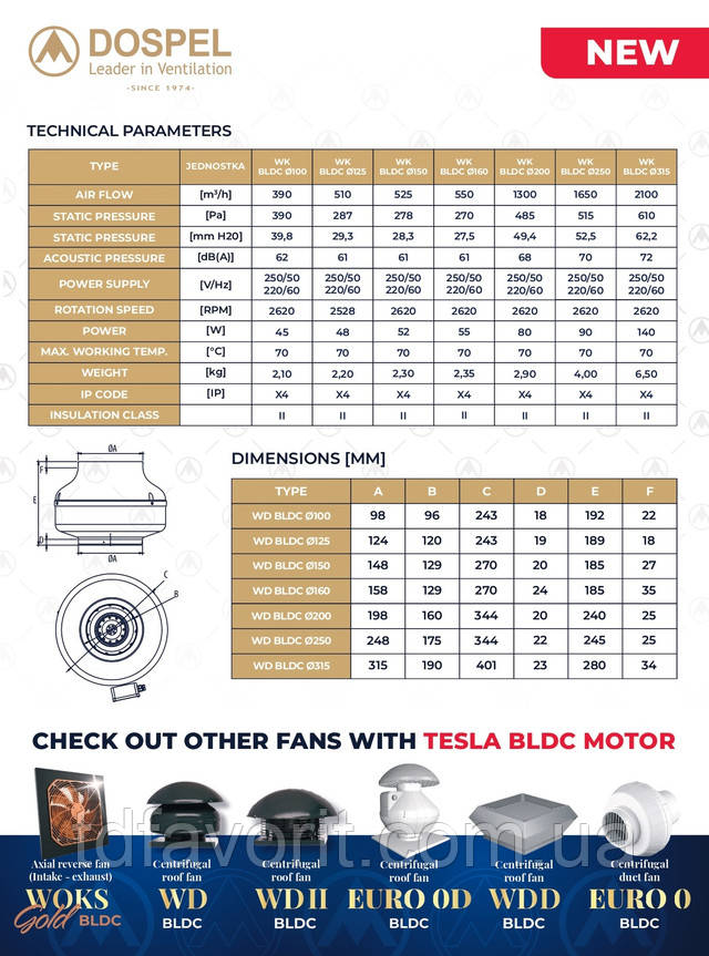 Dospel WK TESLA-BLDC 150 вентилятор для круглых каналов DOSPEL (Польша) Версія з двигуном N.Tesla BLDC