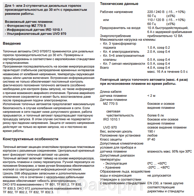 Топковий автомат захищений вогнестійким прозорим пластиковим корпусом із роз'ємним з'єднанням. Центральний кріпильний гвинт фіксує топковий автомат на цоколі.Топковий автомат містить таймер на основі мікропроцесора, контроль полум'я та схему перезапуску. Ручний перезапуск із положення блокування, а також ручне блокування забезпечуються кнопкою зі світлодіодною інформаційною системою. Цоколь обладнаний запасними та додатковими клемами, що в поєднанні з кількома кабельними введеннями забезпечує гнучкість електропроводки. DKO 972 додатково взаємозамінна з TF 802, TF 802.2, TF 832, TF 832.3.