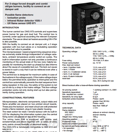 Соковитий автомат DMG 973 контролює потужність газових пальників, а також комбінованих (газ/дизельне паливо). Топковий автомат перевірений і сертифікований відповідно до відповідних європейських стандартів. Можливе застосування на стаціонарних повітряних теплогенераторах відповідно до DIN 4794. За допомогою програми, керованої мікропроцесором, задається гранично стабільний час, незалежний від коливань напруги в мережі, температури довкілля та/або циклів увімкнення. Вбудована інформаційна система сприяє не тільки безперервному спостеріганню подій (особливо важливо для контролю фази запуску), але також інформує про причину можливого аварійного вимкнення. Причина несправності зберігається в пам'яті приладу та може бути відновлена навіть після вимкнення електроживлення. Топічний автомат розрахований на максимальну безпеку в разі коливання напруги. Якщо напруга в мережі падає нижче допустимого рівня, робота припиняється й топковий автомат запобігає повторенню процедури запуску. Отже, безпека системи не зазнає ризику у разі падіння напруги в мережі. Захист від низької напруги працює не тільки під час запуску, а постійно під час роботи пальника.