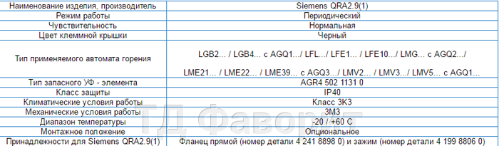 ТЕХНІЧНІ ХАРАКТЕРИСТИКИ ДАТЧИКІВ ПЛАМЕНІ SIEMENS QRA 2.9(1)