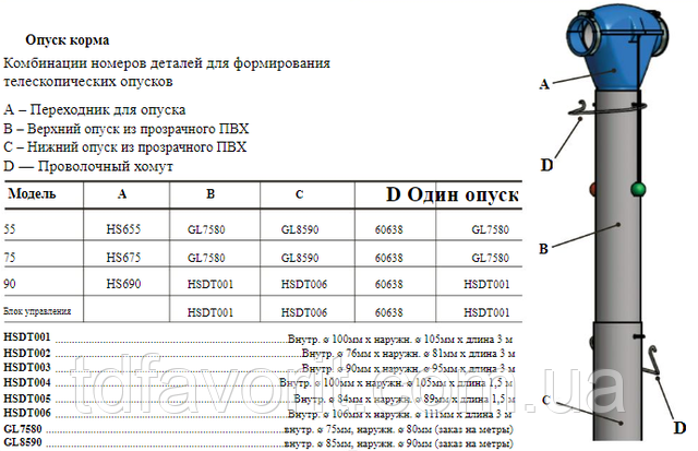 Труба для подавання корму в годівницю. Внутр. ø — 75 мм, зовнішній ø — 80 мм, довжина — 3,66 м. Матеріал — ПВХ. Прозора